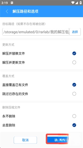 3、选择解压路径,确定文件更新、覆盖方式以及是否删除压缩包,设置完成后,点击【确定】。
