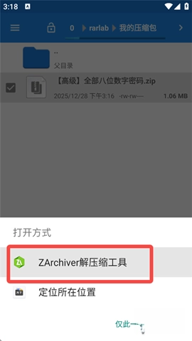 1、在手机中找到要解压的压缩包所在位置,点击该文件,选择以【ZArchiver解压缩工具】的方式打开。