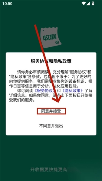 并安装收据通,随后打开该应用。进入应用界面后,点击“同意并接受”选项。
