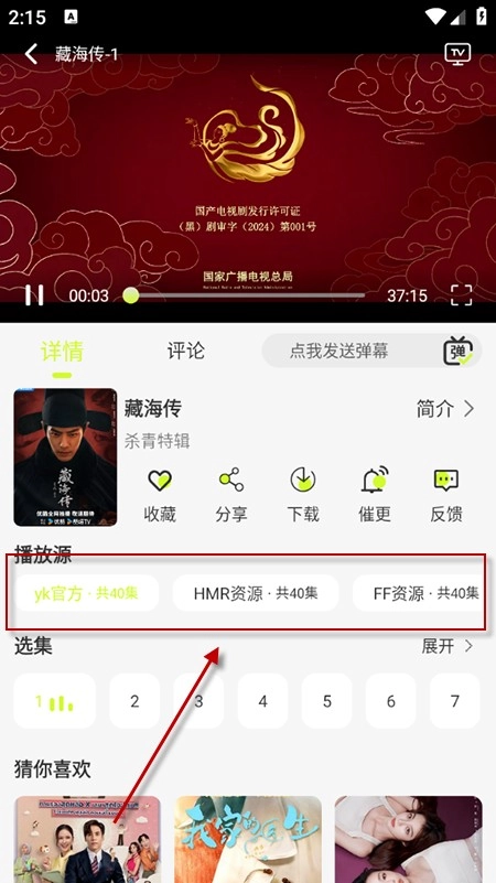 3、在播放卡顿时,点击“播放源”切换线路后开始观看。