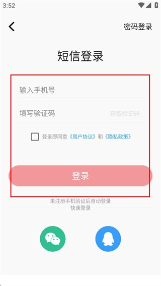 3、在短信登录页面,填写信息并勾选协议后,点击登录按钮即可完成账号登录。