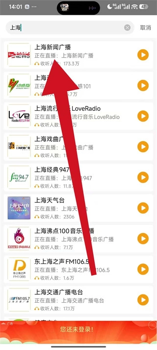 4、在搜索结果列表中,点击目标电台对应的区域,即可开始收听该电台的节目。