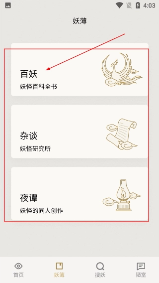 2、进入【妖簿】页面后,可看到【百妖-妖怪百科全书】【杂谈-妖怪研究所】【夜谭-妖怪的同人创作】这三类内容板块,用户可根据需求进行选择。