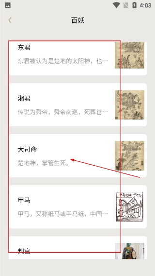 3、进入【百妖】页面后,能够查看【东君】【湘君】【大司命-地神-掌管生死】等各类神祇妖怪的基础介绍信息。