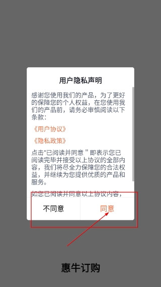 1、在使用【惠牛订购】之前,请先阅读【用户隐私声明】,在确认了解【用户协议】与【隐私政策】的具体内容后,点击【同意】按钮,就能继续使用本产品提供的服务了。