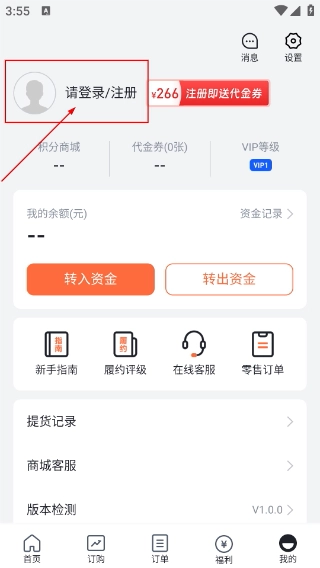3、进入【我的】页面后,点击【请登录/注册】区域,完成登录或注册操作后,即可使用【转入资金】【新手指南】等个人功能。