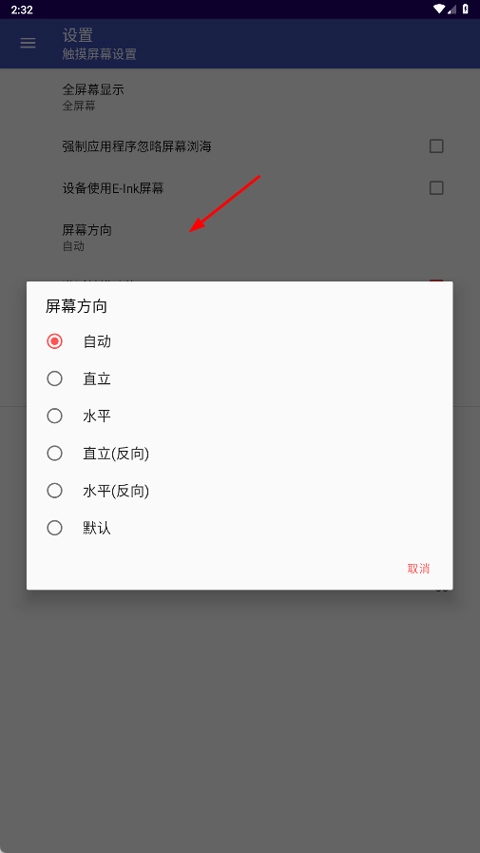 4、最后找到屏幕方向,把“自动”换成“直立”或者“水平”即可。