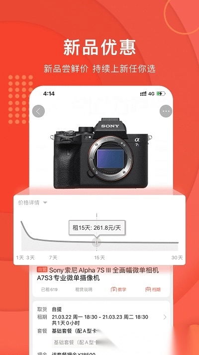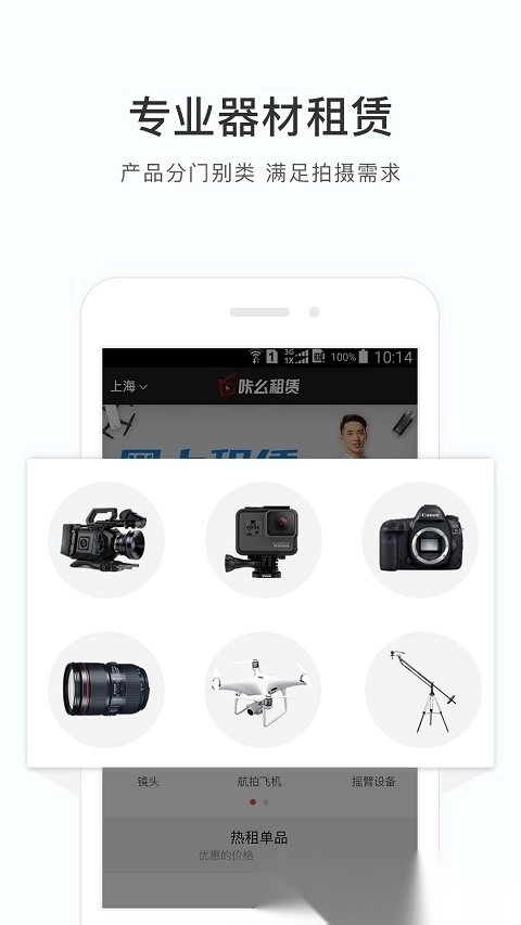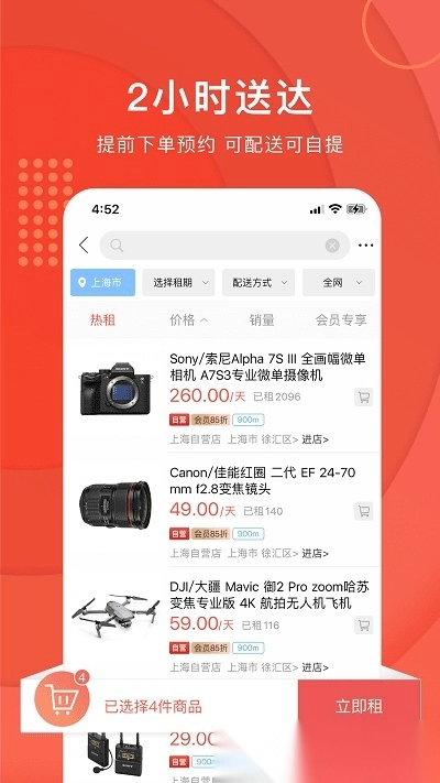 用户可直接在平台内搜索所需的拍摄设备,完成线上预约与下单流程;平台既提供送货上门服务,也支持用户根据自身情况就近选择门店自提设备。