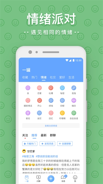 一罐是一款社交软件,在这里没有键盘侠的攻击和道德层面的审判,所有用户都不能设置个人头像、浏览他人主页或是与其他用户互相关注,从根源上避免了信息被追踪的可能。你可以把自己的秘密和各种情绪都放进“罐子”里匿名分享,既能毫无顾忌地吐槽和宣泄内心的感受,也能和他人交换彼此的心事,在这个空间里做回最真实的自己。这款软件运用了十分严格的信息保护机制,能让用户安全地释放生活中的压力,尽情享受这个可以自由交流情绪的专属空间。