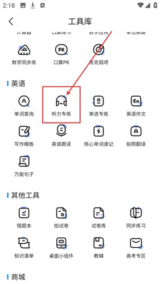1、进入工具库界面后,找到并点击【听力专练】的功能入口,就能进入英语听力练习专区,开始听力训练了。