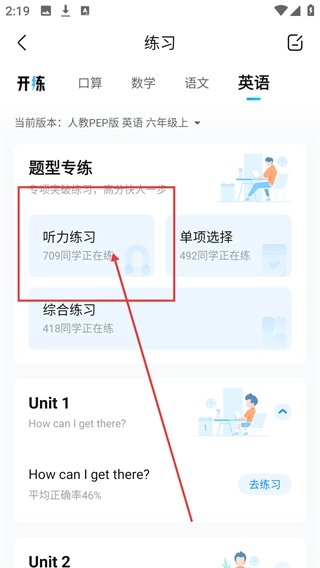 进入练习页面后,切换至【英语】标签页,接着选择【听力练习】这一选项,就能进入听力专项的训练界面啦。