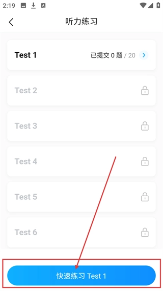 3、进入听力练习页面后,点击【快速练习Test1】按钮,就能启动这套听力题的训练,按步骤完成题目啦。