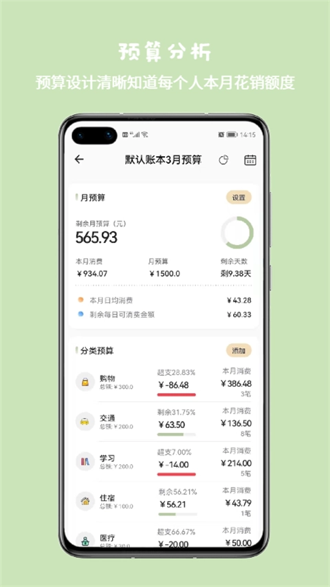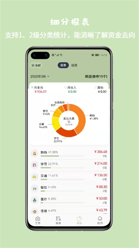 3、借助各类分类报表对用户的支出明细进行统计,从而清晰掌握资金流向,以便及时调整不合理的消费行为。