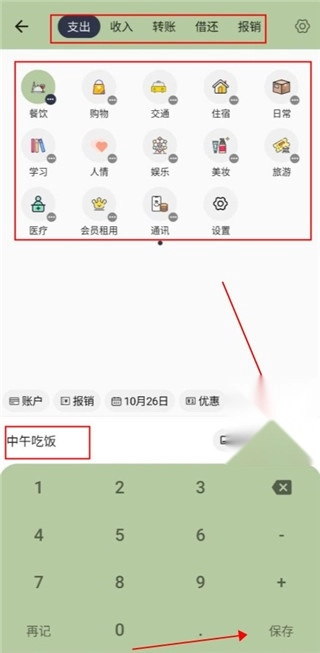 3、在此处可选择支出或收入类型,接着选定具体类别与金额,点击确定按钮即可完成操作。