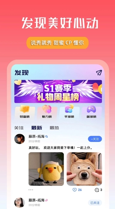 这里有声音甜美的颜值主播,还有可爱活泼的搞笑颜值小哥哥,各种类型的语音厅主播会带来精彩的才艺展示,陪您驱散孤单,收获开心与快乐。您可以和小伙伴们在麦上愉快互动聊天,找到志同道合的队友、搭子,以及兴趣相投的好朋友。