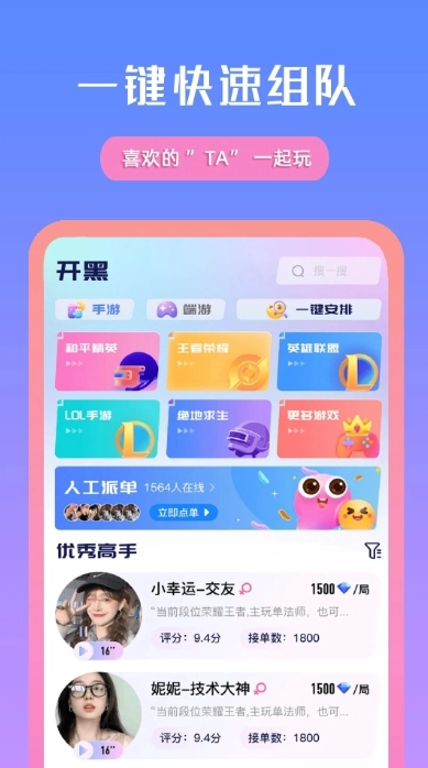 永劫无间、英雄联盟等众多热门游戏类型持续更新;越来越多的高手加入进来,只为让您在与电竞高手组队时摆脱枯燥,找到有趣的话题,还能和小哥哥、小姐姐一起组队吃鸡、共同上分,开启一段欢乐的游戏之旅。