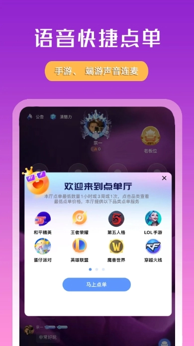 在语音派单厅里,你可以发布订单寻找大神,还能试听大神的声音、和大神直接对话,或者与颜值主播互动,找到适合自己的陪练、开黑队友和组队搭子。
