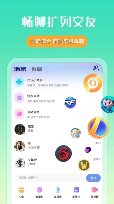 比玩是一款超有趣的语音聊天软件,玩家能在这里找开黑队友、在线PK唱歌,还能快速组局。软件用户特别多,超多小哥哥小姐姐等着和你开黑,赶紧加入吧!