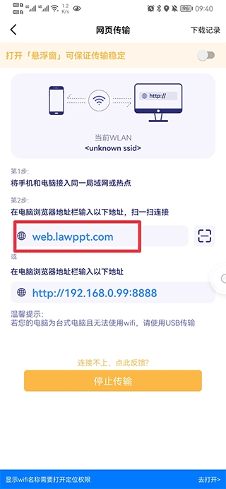 2、按照提示在电脑浏览器里打开下方的网址(注意电脑要和设备处于同一个WIFI网络环境中)。