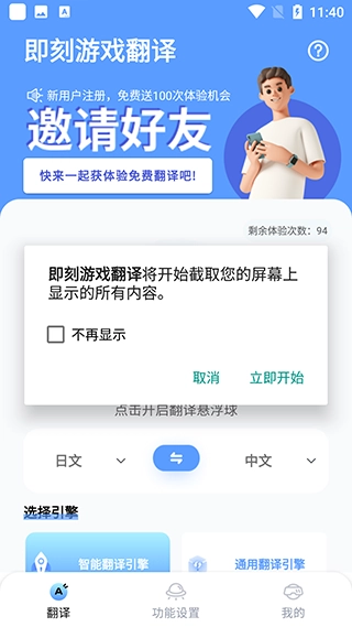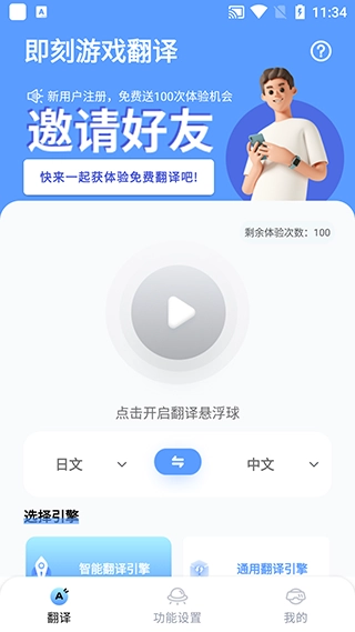 1、在魔趣网即刻翻译里,打开软件后,点击首页中间的开始按钮,就能开启翻译悬浮球。