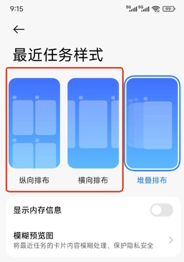 3、可随时进入「最近任务样式」界面,自由切换堆叠式与传统式后台,更改后即时生效,无需重启设备。