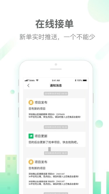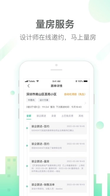 1. 消息推送功能:通过定时发送量房、接单等通知,增强项目及时处理能力,进而提升客户满意度。