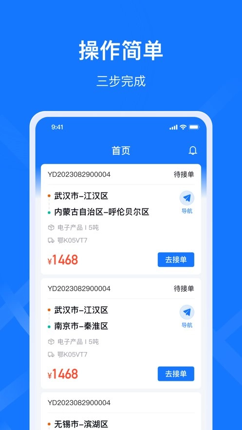 1.司机朋友们在此处能够一键完成下单操作,同时还可以查看所有订单信息以及对应的运费详情。