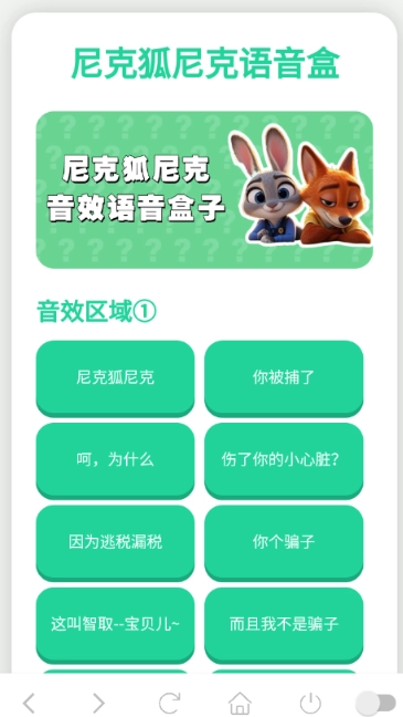 尼克狐尼克语音盒是一款以《疯狂动物城》角色语音为素材制作的播放软件,里面收录了大量经典语音音频,像“尼克狐尼克”“你被捕了”“呵,为什么”“伤了你的小心脏?”这些热门语音全都包含在内,十分有趣。这款语音盒界面简洁,操作也很简单,点击就能播放,用来活跃气氛再合适不过了!
