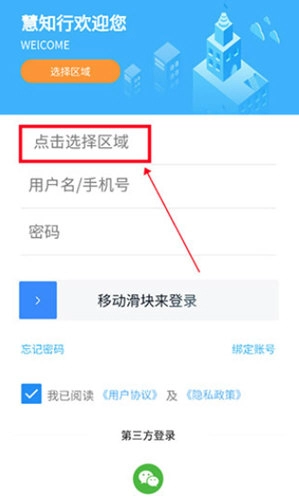 1、在本站好慧知行初中版本,进入登录页,点击“选择区域”。