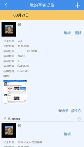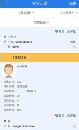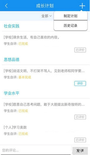 3、学生可对自身与同学进行评价,记录个人成长历程,查询课程安排,同时记录思想道德、初中学业水平测试等不同层面的各类信息。