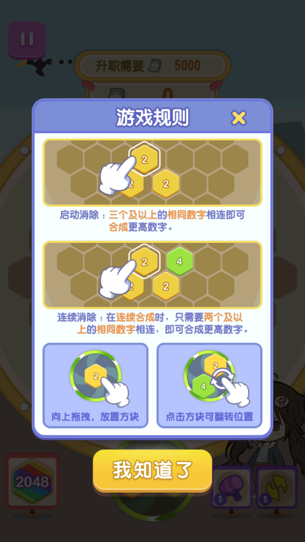 经典的六角消除玩法加上2048,再加上升职总裁,绝对给你带来轻松愉悦的游戏体验。