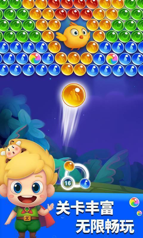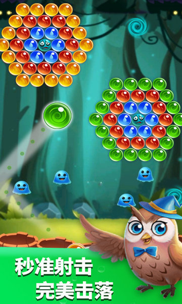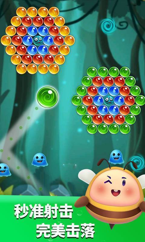 开心泡泡龙发射气泡,将3个或更多气泡颜色相同的气泡击落,使它们消除;