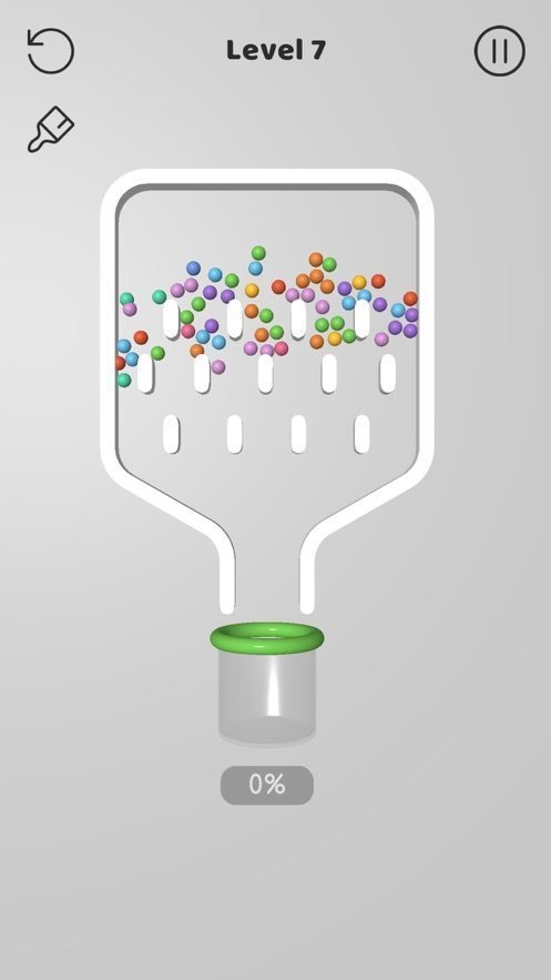 游戏玩法很有趣,你需要按不同的顺序去掉瓶中的别针让瓶子上方的彩球顺利进入到出口外才能通关。