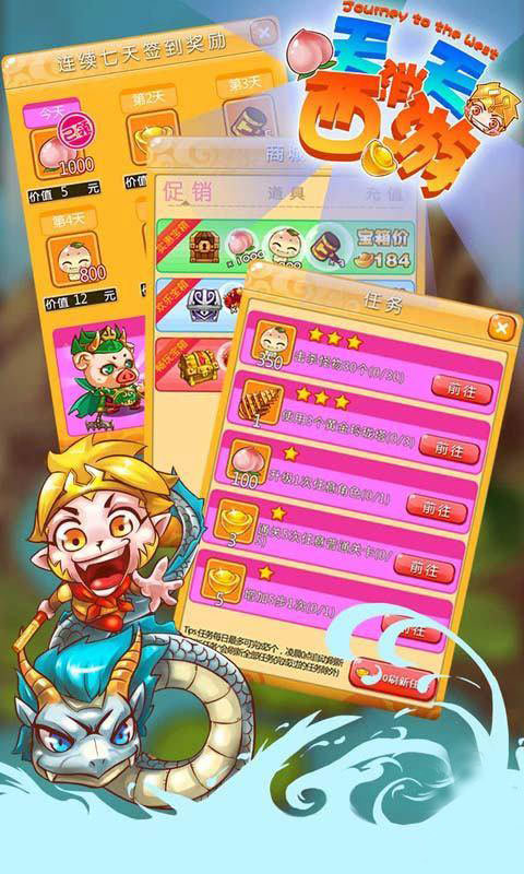 天天消西游有趣的剧情单机游戏,玩家更可与镇元、白骨精、红孩儿、牛魔王等一较高下,功能丰富的游戏道具,新颖的消除方式, 丰富的关卡设计,西行之路等你来消。