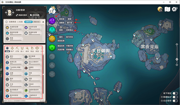 在左侧菜单栏中,选择丢失的岩石神瞳,右侧的地图将显示其分布。