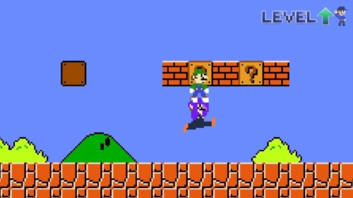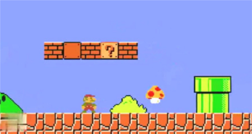 5、遇到金色砖块可以跳跃顶一下,会有金币出现,幸运的话还会获得神奇饮料,图示为"长大"饮料,可以让角色充满力量,变大一倍!