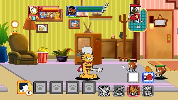 但是食物入侵者们先要面对我们英勇的抗敌勇士们: 选择加菲猫、阿的或者毛毛作为你的将领角色, 并且指挥众多加菲猫漫画中的可爱人物包括: 鸭子伟德、绵羊兰莉、肥猪沃森以及更多有趣角色一起奋起抵抗!