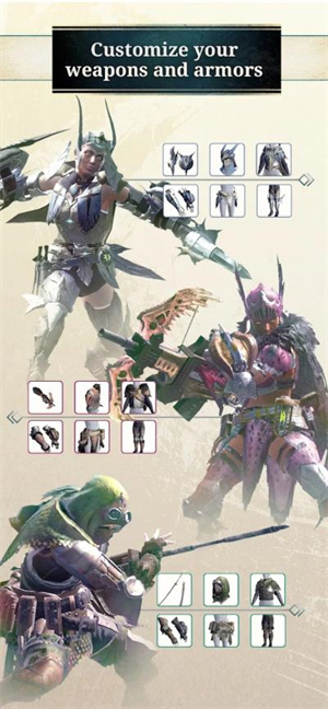 4、武器和盔甲:拥有从剑和盾到锤子和弓箭的各种武器类型,您需要收集材料,锻造和升级武器和盔甲以击败特定的怪物。当您击倒怪物时,您将收到可用于制造更强大武器和盔甲的材料,以便猎捕更危险的怪物。收集铁矿石和怪物骨头等资源,打造强大的盔甲,抵御更强大的怪物攻击。