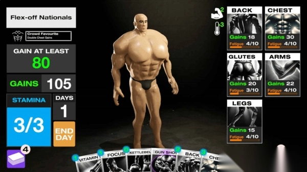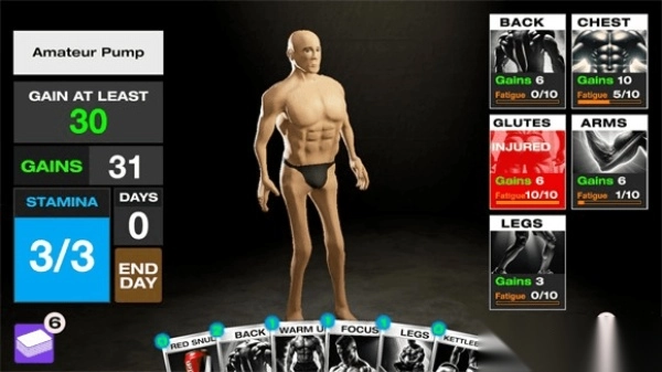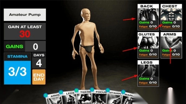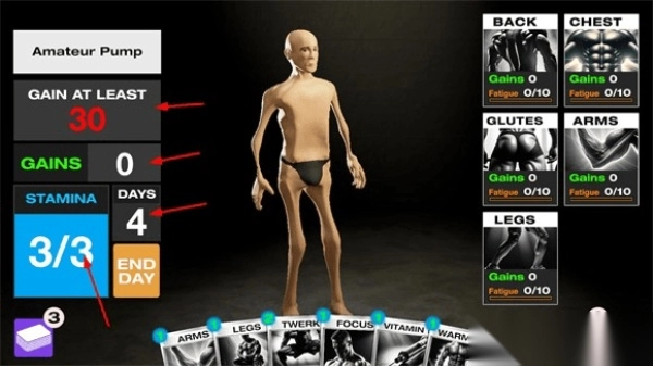 3. 左侧依次为目标、肌肉量、剩余天数、能量数,玩家需在规定天数内达成目标方可获胜。