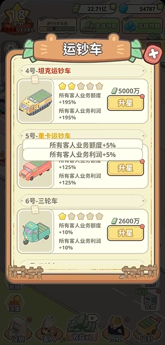 运钞车也是提升收入的重要一环,可通过升星或解锁新类型来实现收入增长。