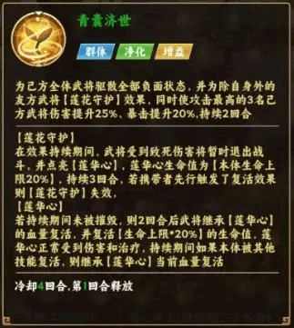 核心辅助神·华佗的一技能【青囊济世】兼具加攻与净化效果,还可将阵亡角色转化为莲华心。若莲华心在队友的控制与护盾庇护下存活两回合,即可令阵亡队友复活,容错率相当高。