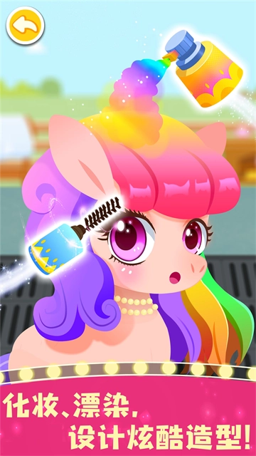 快来给小马打造专属造型:先画上橘粉色的腮红增添好气色,再涂上纤长卷翘的睫毛让眼睛更灵动,接着喷上blingbling的闪粉点缀细节,一套精致妆容就搞定啦!刘海太长遮住眼睛可不行,赶紧拿出剪刀修剪整齐。最后一步,选几款喜欢的染发喷雾轻轻一喷,橙黄、浅紫等缤纷色彩交织,瞬间变身超亮眼的彩虹小马!