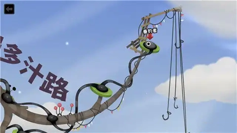 这个关卡的通关方式非常简单,你只需把红色气球系在粘粘框架的顶部,气球就会带着框架飞起来。