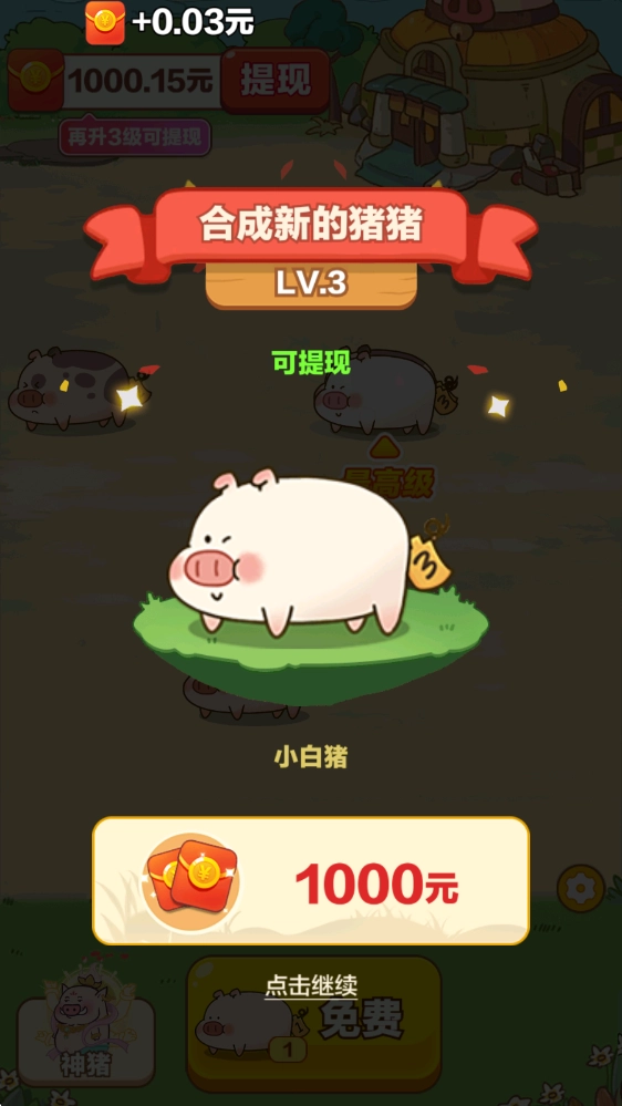 2、游戏内有十多种可爱小猪可供合成解锁,每次解锁都能拿到奖励,等级越高,奖励就越丰厚哦。