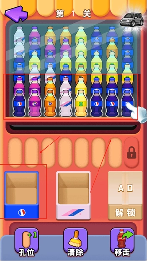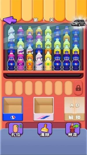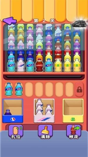 1、进入游戏后,玩家会看到一台摆满不同口味饮料的自动售货机,需把颜色相同的饮料放进对应颜色的箱子里完成整理。
