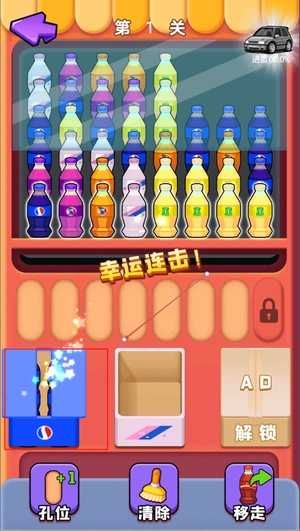 2、点击屏幕选择对应颜色饮料送入箱子,当集齐六瓶就会被打包完成,实现完美消除。