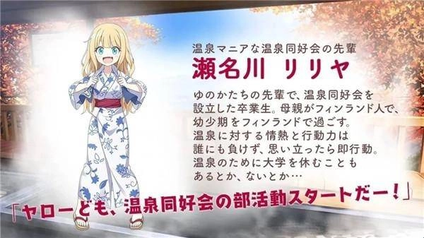 创立温泉同好会的毕业生莉莉亚,由于母亲是芬兰人,她在童年时期便在芬兰生活,对温泉的喜爱程度堪称狂热——只要脑海中浮现温泉的念头,就会立刻付诸行动,甚至还曾为了去泡温泉而逃课。