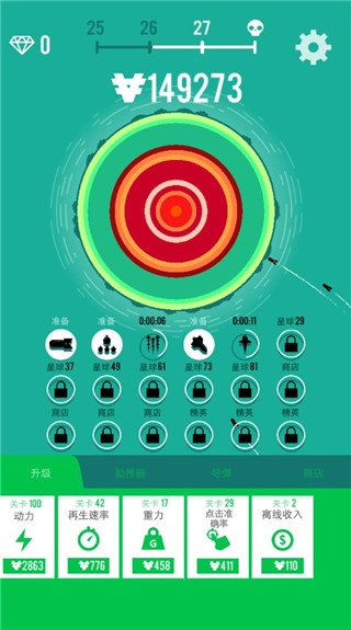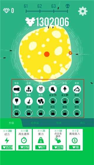 3、摧毁星球后我们能获取金钱,这些金钱可用于点击升级轰炸的动力、再生速率、重力、点击准确率等属性。