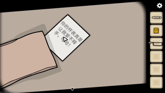 6、用钥匙打开铁栅栏,和小偷交谈,把纸币放进椅子下方的盒子里,接着将时间调整到9点整,之后再次回到椅子下的盒子那里,就能拿到铁锯。