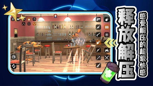 3.武器选择功能栏:画面右侧的纵向按钮栏提供多种攻击道具选择,玩家可自由切换枪械、炸弹、电锯等武器,通过不同攻击方式尽情释放压力